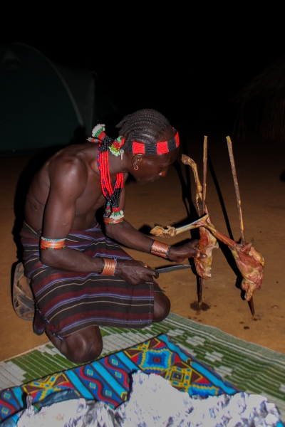 Second, the most important decision for this trip is choosing the right guide. I have read about tours that are based in hotels and lodges, with tourists driven in to tribal villages for a few hours to take pictures of the locals and go. The most apt description of this practice is “human safari”. My friends and I were quite fortunate to find Emanuel (Emany) Cheneke of Explore Omo Valley, who organized a mix of hotel nights and overnight stays in tribal villages with the Hamer, Bena, Mursi and Ari for us, as well as a night in Mago National Park on my first trip. I cannot recommend Emany enough. He is from the area, takes great pride in introducing this part of the world to guests, is well-known and respected by the tribes, and is overall just a great guy. Whether you use his services or find somebody else, be sure that your itinerary includes at least a few nights camping with the tribes in their villages. Doing short visits during the day will make it really hard to experience the amazing hospitality of people here, something you have to live to believe. Camping overnight allows you to spend some time learning the tribal culture, sharing drinks and perhaps a meal, as well as laughs with your hosts, and not just observe tribal life in the Omo, but feel like you are a part of it. The first time I ate goat was in a Hamer village, cooked by the head of the family we were staying with and it was one of the most memorable meals of my life and quite delicious.